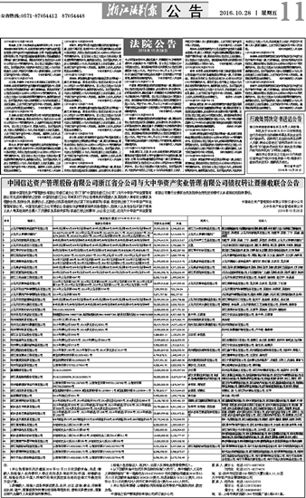 中国信达资产管理股份有限公司浙江省分公司与大中华资产实业管理有限公司债权转让暨催收联合公告