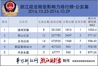 “温州交警”作为常胜将军,依然以WCI值1052.42高居榜首;“萧山公安”泰然自若,继续位居第二;“义乌公安”强势回归,杀回前三。