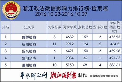 “路桥检察”战斗力爆棚,以475.95的WCI值略胜一筹,摘得桂冠;老牌优势公号“杭州检察”“绍兴检察”时隔一周,再次复苏,盘踞第二、三名。