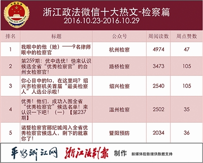 热文榜已被检察官评选活动霸屏。TOP前三的为“杭州检察”文——《我眼中的他(她)——9名律师眼中的检察官》、“路桥检察”文——《第259期:优中选优!快来认识候选全省“优秀检察官”的台州女检察官!》、“绍兴检察”文——《你心目中的TA,在这里吗?绍兴市检察机关首届“最美检察人”人选公示啦!》。