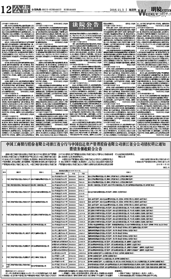 根据中国工商银行股份有限公司浙江省分行与中国信达资产管理股份有限公司浙江省分公司签署的《资产转让协议》,中国工商银行浙江省分行(含各分支行)已将其对下列借款人及其担保人享有的权利(包括但不限于担保债权、违约金债权、损失赔偿权、利息债权)依法转让给中国信达资产管理股份有限公司浙江省分公司。中国工商银行股份有限公司浙江省分行与中国信达资产管理股份有限公司浙江省分公司联合公告通知各借款人及担保人以及其他相关各方。
