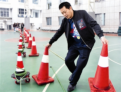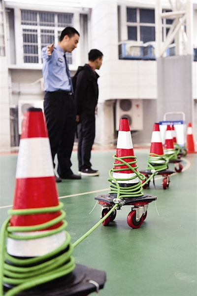 昨日的发布会上,举行了一场特别的“比赛”——比谁40米对角线“摆桩”快。只见一名民警拿着一个个隔离锥,来回跑动,摆完一个对角线花了大约1分半钟;而另一名民警则使用“摆桩神器”。只见一辆手推车上连接着七八个装着轮式圆盘底座的隔离锥,中间用尼龙绳固定,他用力一推车,这些锥子在尼龙绳的带动下跟着车跑,大约10秒钟,隔离锥已经摆放完毕。