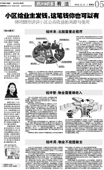 本周二晚上7:30,浙江泽厚律师事务所的孙莉律师,就从这则令网友有所启发的新闻说开去,为本报微信公众号(zjfzbs)主办的“法治微沙龙”的听友,讲解了小区公共收益从何来、怎么管、如何用。本期《看法》栏目将此次“微课”的精彩内容整理刊出,方便大家阅读。