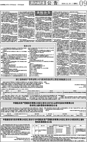 中国建设银行股份有限公司浙江省分行与中国信达资产管理股份有限公司浙江省分公司债权转让通知 暨债务催收联合公告
