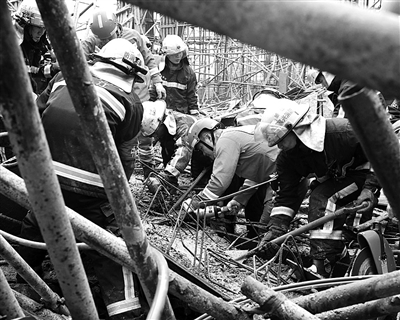 消防官兵赶到现场时,已经有4名埋压较浅的工人被工友救出后送往医院,另有1名工人被深埋在脚手架下。经过现场勘查,消防官兵立即使用破拆工具对现场的脚手架进行清理,经过2个小时的救援,被困工人被救出并送往医院救治。
