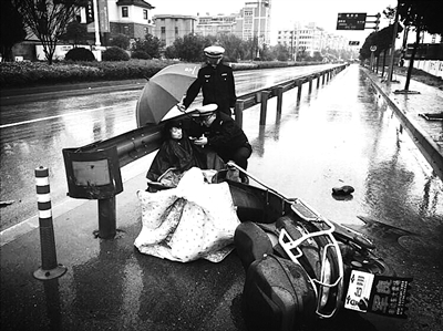 照片里蹲着的交警叫胡海峰,是杭州大江东公安分局交警大队的辅警。当日上午8点多,他跟搭档倪冬青一起上路巡逻。行至新湾大道复兴路路口时,他们发现一辆倒着的电动车旁,卧着一名年轻女子,一名路人正替她撑着伞。胡海峰和倪冬青赶紧上前了解情况。原来,女子小马(化名)上班时,因雨天路滑,一不小心摔在了地上。浑身疼痛的她怎么也爬不起来,一名热心的路人刚好经过,帮她打了伞。