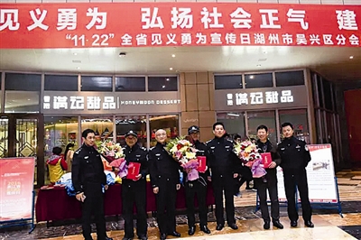 昨天是我省首个“见义勇为宣传日”。在这个充满正能量的日子里,各地开展了丰富多彩的活动,传播社会正能量,激励更多人加入见义勇为行列,让浙江成为孕育见义勇为精神的一方热土。在湖州吴兴区,“浙江省见义勇为宣传日”专题宣传活动热闹展开,公安机关向见义勇为先进分子送上鲜花(右上图)。在长兴,公安机关走访慰问了市级见义勇为先进分子杨汉根师傅,向英雄表达敬意(左图)。在常山、湖州南浔区、台州等地,公安机关通过播放宣传片、设置展板、发放资料等,宣传见义勇为先进事迹(右下图)。