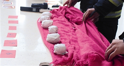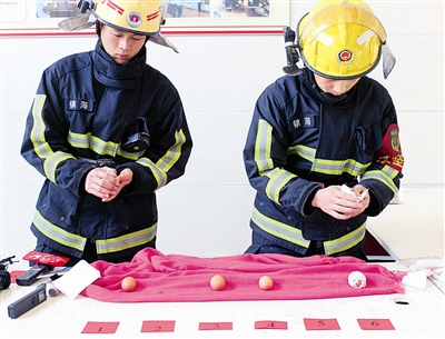 | 消防员用围巾将鸡蛋裹好模拟人体穿衣效果 |