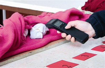 数据记录完毕后,2名消防员将6种不同品牌的“暖宝宝”,按照使用说明均撕下贴纸,每片“暖宝宝”焐一个生鸡蛋,然后用一条羊毛围巾裹住,以模拟人体穿衣状态下使用暖宝宝的效果,并用测温枪不定时在围巾外进行测温。