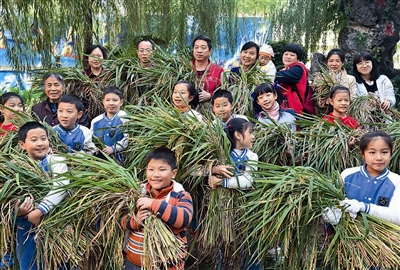 当日,广西南宁市滨湖路小学的部分学生和家长来到学校,收割自己种植的稻谷,共享劳动收获的快乐。据滨湖路小学有关负责人介绍,该校在校园里开辟出10多块土地,供孩子们种植玉米、水稻、向日葵、蔬菜等农作物,让学生们了解不同农作物的生长状况,亲身体验农事艰辛,培养他们的节俭意识、观察及动手能力。