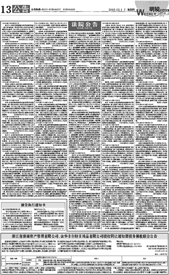 徐志宏:本院已受理原告杨纪才与被告徐志宏买卖合同纠纷一案,因无法通过其他方式向你送达法律文书,现依法向你公告送达起诉状副本、证据副本、应诉通知书、举证通知书、外网查询告知书、合议庭组成人员通知书、风险提示书、民事裁定书及开庭传票。自公告之日起经过60日,即视为送达。提出答辩状和举证的期限为公告送达期满后次日起15日内。本案定于2017年2月16日9时30分在本院第十六审判庭公开开庭审理本案,逾期将依法缺席裁判。宁波市鄞州区人民法院