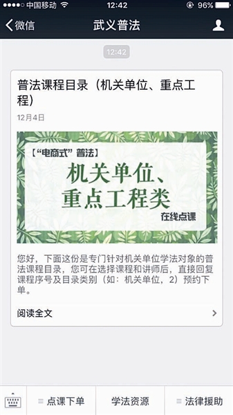进入“武义普法”微信公众号,点击“点课下单”,就可以自主选择由各单位、律师事务所、法律服务所组成的百名普法讲师团提供的共155种宣讲课题,如果所需内容不在课程目录上还可以按照具体需求进行定制。“点课”完成后,武义县司法局将为点课人进行预约登记、安排课程。今年截至目前,通过这种点课方式,该县已开讲普法课堂123场,听课总人数达20532人次。微信小编告诉记者,“宪法宣讲浙江行”活动开始后,先后有5个单位下单宪法类课程。