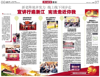志愿者讲师团说宪法、口袋书小读本学宪法、微课堂微视频看宪法、宪法主题公园观景识宪法、微信微博上考宪法……我省“宪法宣讲浙江行”活动正式启动以来,全省各地根据不同群体的需求和特点,新老阵地齐发力,线上线下同步走,或是将宪法知识融入身边人和事娓娓道来,或是以“互联网+”的理念助推宪法宣传,掀起了全民学宪法的热潮。