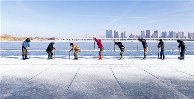 冬季来临,哈尔滨冰雪旅游进入旺季,当地采冰人开始在松花江江面上忙碌,将采集的冰块运往哈尔滨冰雪大世界等场地。图为12月4日,采冰人在松花江哈尔滨段江面上采冰。