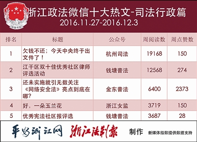 热文榜,关注度较高的“杭州司法”文章《欠钱不还;今天中央终于出文件了 !》排名第一,“钱塘普法”的《江干区双十佳优秀社区律师评选活动》排名第二。小编心得:想要上榜,不妨试试推送评选、投票和重大新闻热点。