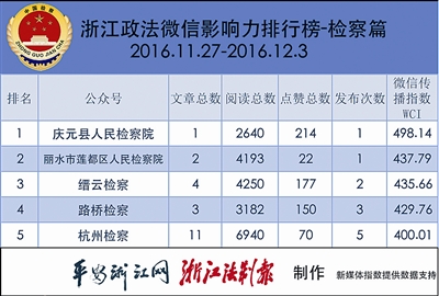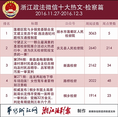 热文榜中,“丽水市莲都区人民检察院”的《莲都区院与乡镇党委联合发文 建立党员干部违法违纪问题相互通报制度》获得第一名,“庆元县人民检察院”的投票活动《守望正义——群众最满意的基层检察院推介活动火热进行中,请为庆元检察院投宝贵的一票!》位列第二,“新昌检察”的《第286期:新昌县梅渚镇梅渚村原村民委员会主任吕明均及村民吕明华、吕军明贪污案一审宣判》排名第三。