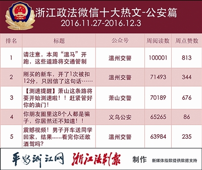 “温州交警”的热文《请注意,本周“温马”开跑,这些道路将交通管制》和《刚买的新车,开了1次被扣12分,只因信了这句话……》分别占据冠亚军宝座,“萧山交警”的热文《【测速提醒】萧山这条路将要开始测速啦!!赶紧管好你的油门!》获得季军。