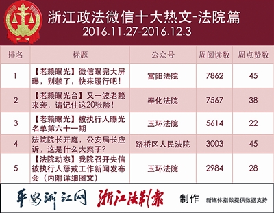 法院热文榜中,“老赖”自然是主线,“富阳法院”“奉化法院”“玉环法院”三家的【老赖曝光台】分别排名第一、第二、第三。