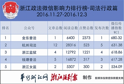司法行政榜,“杭州司法”WCI指数高达631.38,夺得第二名;一直在走文艺温情路线的“浙江监狱”排名第三。