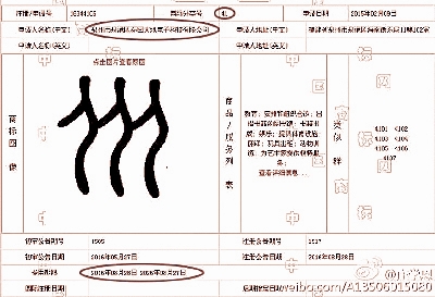| 庄学恩微博配图显示,人大校徽商标已到期(左图),春回大地公司注册的图案相似商标获得通过 |