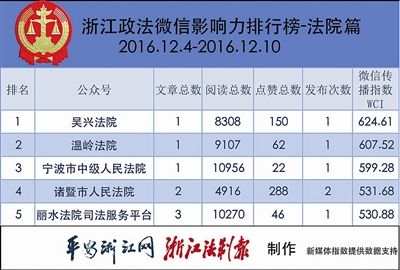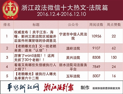 热文榜,“宁波市中级人民法院”的《权威发布|关于江东、海曙、鄞州三家法院区域撤并后案件所属管辖的协调意见》排名第一,“温岭法院”的《【老赖曝光台】又一批老赖来袭,请来“认领”!》排名第二,“吴兴法院”深夜抓老赖微信文《厉害了word法院!!这两天抓了30个老赖!!》排名第三。