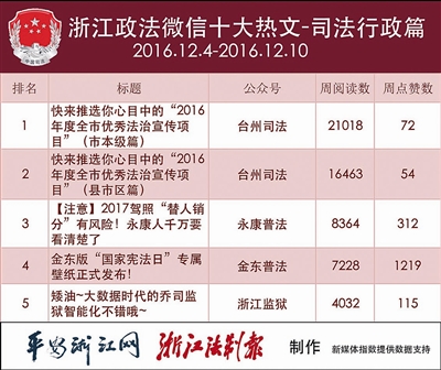 热文榜,“台州司法”的投票活动《快来推选你心目中的“2016年度全市优秀法治宣传项目”》市本级篇和县市区篇分别拿下第一、第二名,“永康普法”的《【注意】2017驾照“替人销分”有风险!永康人千万要看清楚了》排名第三。小编心得:司法行政榜上,投票活动多,更容易吸引粉丝。