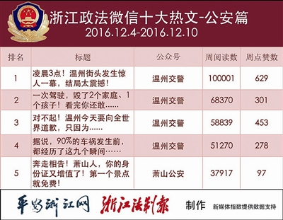 “温州交警”不仅长期霸占公安榜榜首,还包揽了本期热文榜前四名。热文前两名均为视频短片,其中第一名《凌晨3点!温州街头发生惊人一幕,结局太震撼!》盘点了日常生活中常见的交通违法行为,触目惊心的画面让周阅读量破10万;热文第三名《对不起!温州今天要向全世界道歉,只因为......》宣传温州的美。小编心得:交通法律法规短视频宣传比文字更有冲击力。