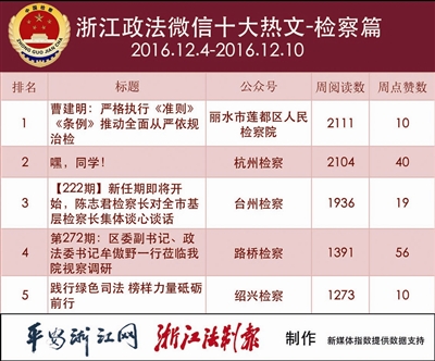 热文榜,“丽水市莲都区人民检察院”的《曹建明:严格执行<准则><条例>推动全面从严依规治检》获得第一名,“杭州检察”走进多家学校给未成年人带去了法治宣讲活动,编写成热文《嘿,同学!》排名第二,“台州检察”的热文《【222期】新任期即将开始,陈志君检察长对全市基层检察长集体谈心谈话》排名第三。