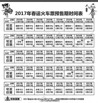 关于春运火车票的最新消息:明年春运时间定于2017年1月13日-2月21日,按照铁路部门互联网、电话购票提前30天的最新规定,12月15日也就是本周四,可以购买春运首日火车票。12月29日可以购买除夕的火车票。注意,网站和手机App售票时间由每天7:00提前至6:00。