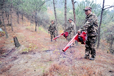 半个多小时后,来到了半山腰。楼钟华看到防火带上有大量枯草、落叶和树枝,立即和队员们拿出随身携带的装备,清理了起来。“一旦发生山火,这些树枝和枯草会使山火蔓延至山岗的另一边。”楼钟华说,冬季的森林火险等级较高,他和队员们每天都会按计划巡山,除了劝导老百姓不要在山上使用明火外,最主要的一项任务就是清理防火带上的枯枝、落叶。