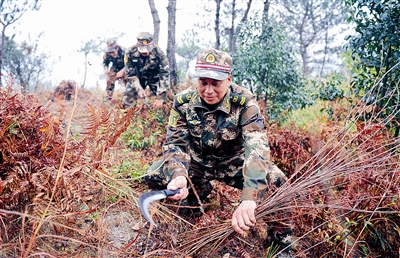 | 楼钟华和队员在巡山过程中清理防火带上的杂草 |