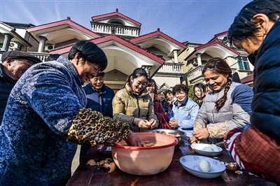12月15日,湖州市吴兴区织里镇举行一系列传统趣味农事节庆活动,迎接即将到来的新年。图为村民参加趣味剥鸡蛋比赛。