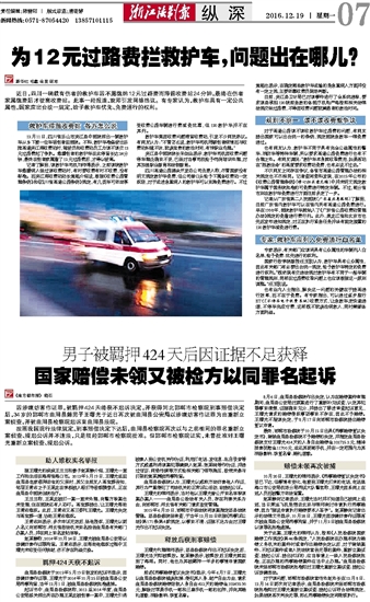 浙江法制报 纵 深 00007 为12元过路费拦救护车,问题出在哪儿? 2016-12-19 2 2016年12月19日 星期一