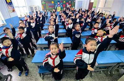 12月19日,河北省邯郸市邯山区渚河路小学的学生们在教室内做课间操。