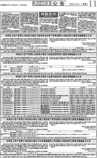 中国东方资产管理公司杭州办事处与浙江浙清资产管理有限公司债权转让暨债务催收联合公告