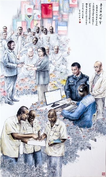 监狱借G20峰会之机,在外国籍服刑人员中掀起了汉语学习的高潮。本幅作品汲取了外国籍服刑人员学汉语、参加国家考试、获得汉语认证、“喜迎G20”活动四个代表性场景,真实反映了监狱对特殊群体的教育改造工作。