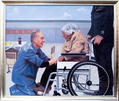 本作品根据真实场景创作。监区警官为了帮助服刑人员实现心愿,特意千里迢迢到服刑人员家中,将长期未见儿子的老母亲请到亲情帮教现场,服刑人员跪在母亲面前失声痛哭。作品将这感人一幕记录下来。(“乌头马角”寓意不可能实现的事情)