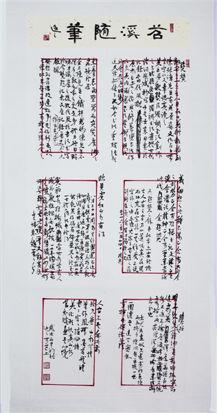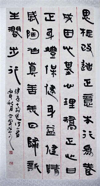 此书内容围绕监狱开展的“健康+”改造模式,以“健康+”内容后缀三字而成的七言诗,书写风格以帛书、竹简为基,略参篆书笔意。帛书、竹简的章法及字形散发着自由、率真的气息,篆书的线条圆润中带有刚劲之意。此二者正是作者所追求的为人之道。