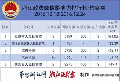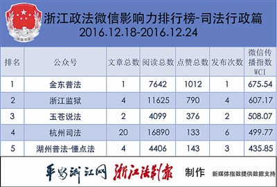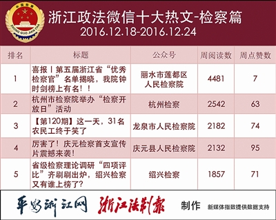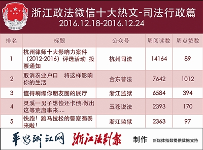 热文榜,“杭州司法”的《杭州律师十大影响力案件(2012-2016)评选活动投票通知》排名第一;“浙江监狱”将浙江省监狱系统的教育改造展示作品做成如诗如画的图文微信《值得刷爆你朋友圈的展厅》,大受粉丝好评,获得第三名。小编心得:“浙江监狱”在保持自身特色的同时求新求变,使其排名一直靠前。