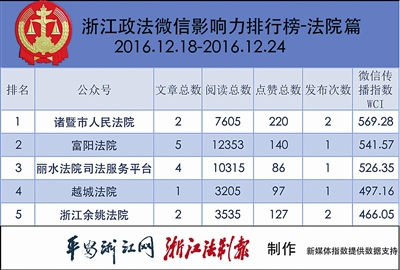 法院榜,“诸暨市人民法院”本期保持第一名,“富阳法院”排名向前进了两步获得第二,“丽水法院司法服务平台”落后一名排名第三。