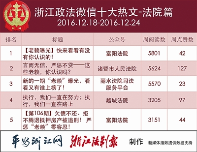 热文榜,小编带你看看各地“老赖”长啥样。“富阳法院”的《【老赖曝光】快来看看有没有你认识的!》第一名,“诸暨市人民法院”的《言而无信,严惩不贷——这些老赖,你认识吗?》第二名,“丽水法院司法服务平台”的《新的一期“老赖”曝光,看看又有谁上榜了!》第三名。