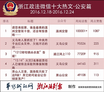 热文榜上,长期占据榜首的“温州交警”上周做了一个投票微信《请您来投票,谁是最美的温州交警双十佳,还会有惊喜哦……》,拿下第一名;“义乌公安”的《义乌有人要抓狂了!中央终于出红头文件,欠钱不还的将……》解读了惩治老赖的12大酷刑,获得第二名;“浦江网上110”的杀人案《“1212郑宅镇凶杀案”告破!》排名第三。