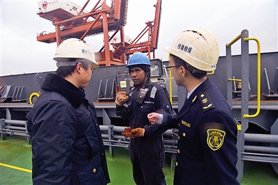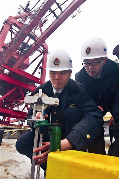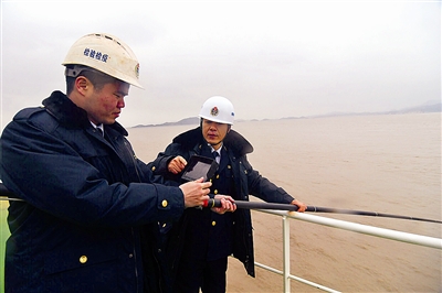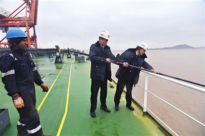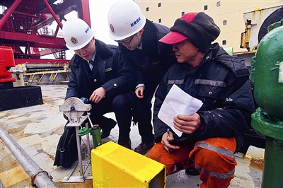 其实,在上船前,舟山检验检疫局六横办事处办公室主任贺杰就已经细致地布置好了检查内容,要求另外3个小伙子安全、仔细地完成工作。上船后,这个四人小分队就有条不紊地分头行动起来,有的询问船员,有的测量压舱水,有的做水尺计重(通过测量船舶吃水深度来计算货物重量,以此维护贸易公平公正,确保国内收货人利益)……