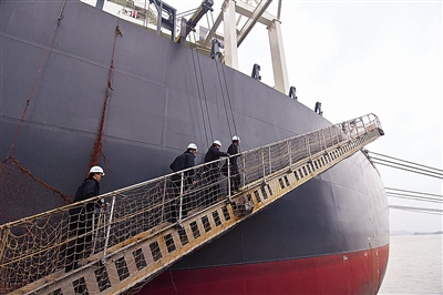 不远处,葡萄牙籍货船“辛里希奥登道夫”号装载着10.6万吨铁矿石,静静地停靠在泊位上。一架10余米高的舷梯从这个庞然大物上缓缓下降,摇摇又晃晃。检验检疫人员轻车熟路地踏上舷梯,轻轻松松上了船,记者咬咬牙,强忍着头晕目眩,也爬了上去。
