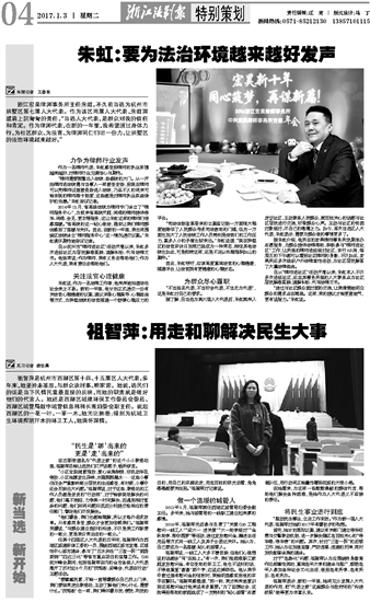浙江宏昊律师事务所主任朱虹,不久前当选为杭州市拱墅区第七届人大代表。作为该区两届人大代表,朱虹深感肩上沉甸甸的责任,“当选人大代表,是群众对我的信任和肯定。作为律师代表,在新的一年里,我希望通过身体力行,为社区群众、为法官、为律师同仁们出一份力,让拱墅区的法治环境越来越好。”