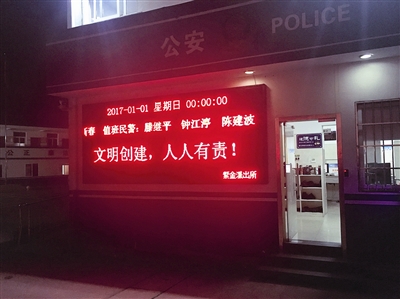 新年的零点时刻尚未来临,陈建波的微信朋友圈里,小伙伴们早已按捺不住激动,发出了在各地跨年的照片。2017年1月1日00:00,陈建波拍下了新年第一张照片——派出所门口的大屏幕上,写着3个值班民警的名字,其中之一便是他。1分钟后,他发出了2017年的第一条朋友圈微信:“你好,2017!”