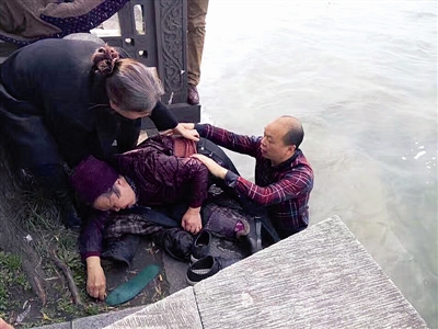 本报讯 昨天中午12点多,杭州大华饭店附近,一名老奶奶不慎跌进西湖。危急时刻,一群热心人有的跳水救人,有的帮忙施救,有的拨打急救电话,用凡人善举温暖了三九时节的杭城。