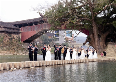 1月9日,泰顺县公安局在泗溪镇廊桥文化园举办了首届“铁军情·廊桥梦”集体婚典。10对新人中,有的新郎是民警,有的新娘是民警,也有新郎新娘都是民警的“双警家庭”。