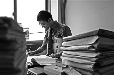 在龙泉市人民检察院,有一位穿着“盔甲”的公诉人,从一场车祸中死里逃生的他,在腰椎骨折卧床三个多月后,提前返岗工作,每天靠着腰间30厘米长的护具支撑着伏案、提审、开庭;他也是科室里大家都信任、崇拜的“老王”,碰到疑难复杂的问题,大家总会第一个想到他。他就是龙泉检察院公诉科科长王贯省。