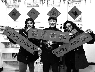 1月17日,一名社区居民(中)和两名外国留学生共同展示即兴创作的书法作品。